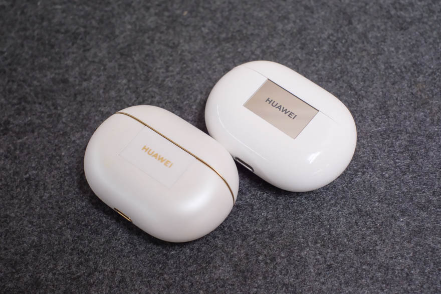 HUAWEI FreeBuds Pro 4のケース正面。左が4で右が3。前作はAirPods Proとほぼ同じ質感のツヤツヤ仕上げだったが、FreeBuds Pro 4は表面がサラサラした素材に変更された。